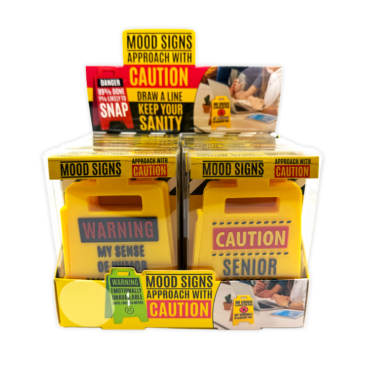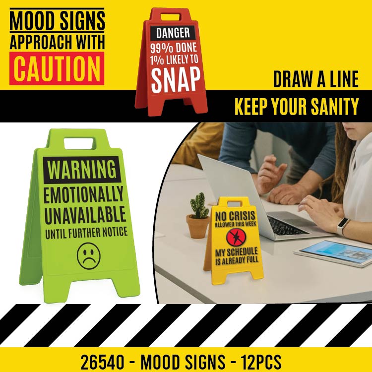 Warning: hilarity ahead! This 4.75 INCH 3D Standing Mood Caution Sign Assortment delivers cheeky, dimensional signs that humorously flag everything from coffee addiction to Monday blues. Each piece stands independently, making them ideal for desks, shelves, retail displays, and gift baskets. The vibrant designs and witty messaging appeal to office workers, students, and novelty enthusiasts. Comes retail-ready in a display-friendly pack—stock it and watch customers grab them for themselves or as gag gifts. Pure fun in compact form.