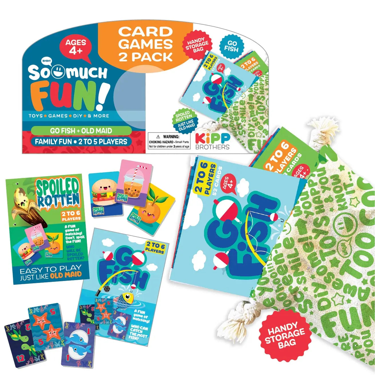 Classic family game night FUN! Go Fish and Spoiled Rotten (Just like Old Maid) both in one handy canvas bag you can take with you. Standard playing card size. Twelve 2 packs per inner box with toy bin card included for use on the So Much FUN! Toy Bin Program corrugated display or in the clear toy bin pockets. Product fits short or tall bins.