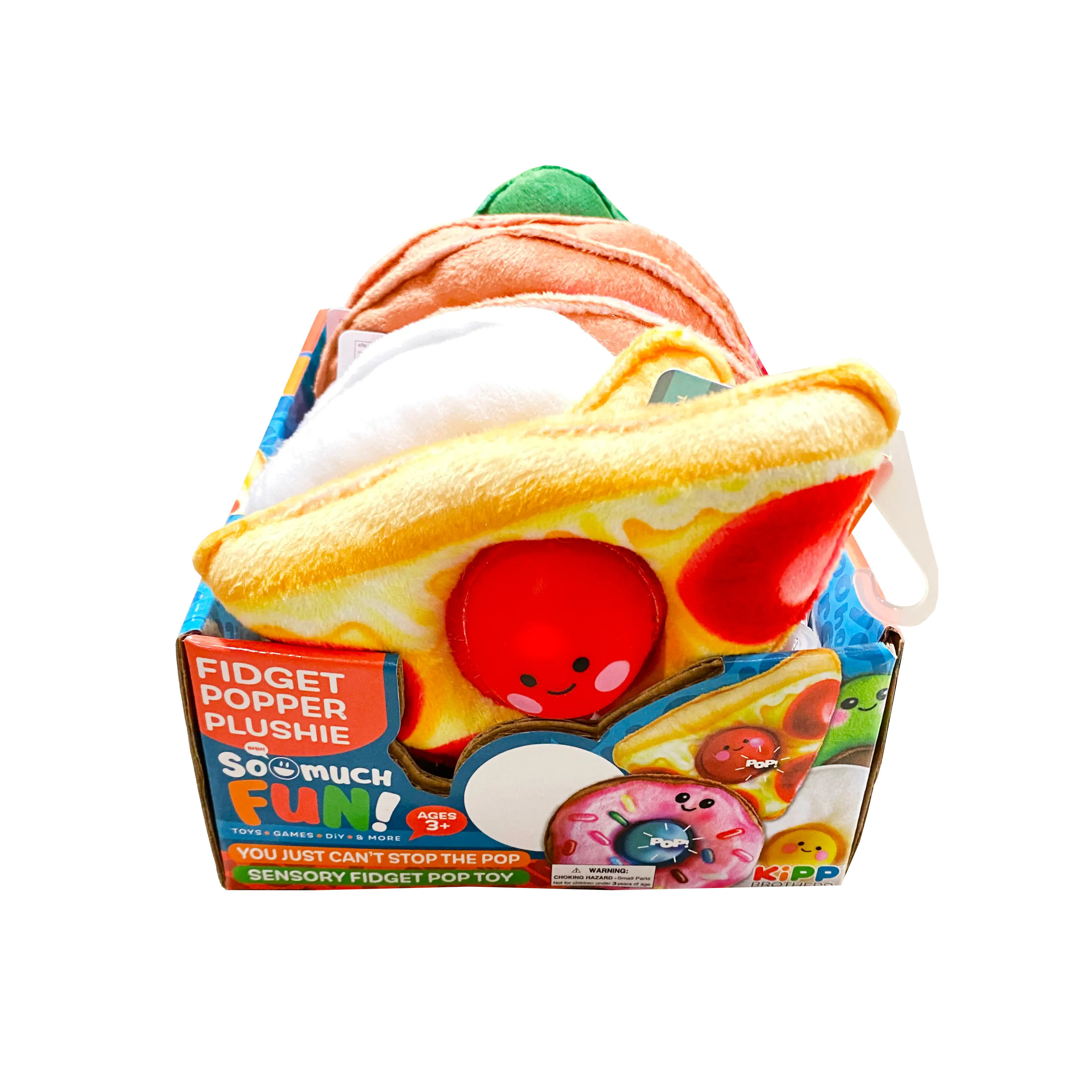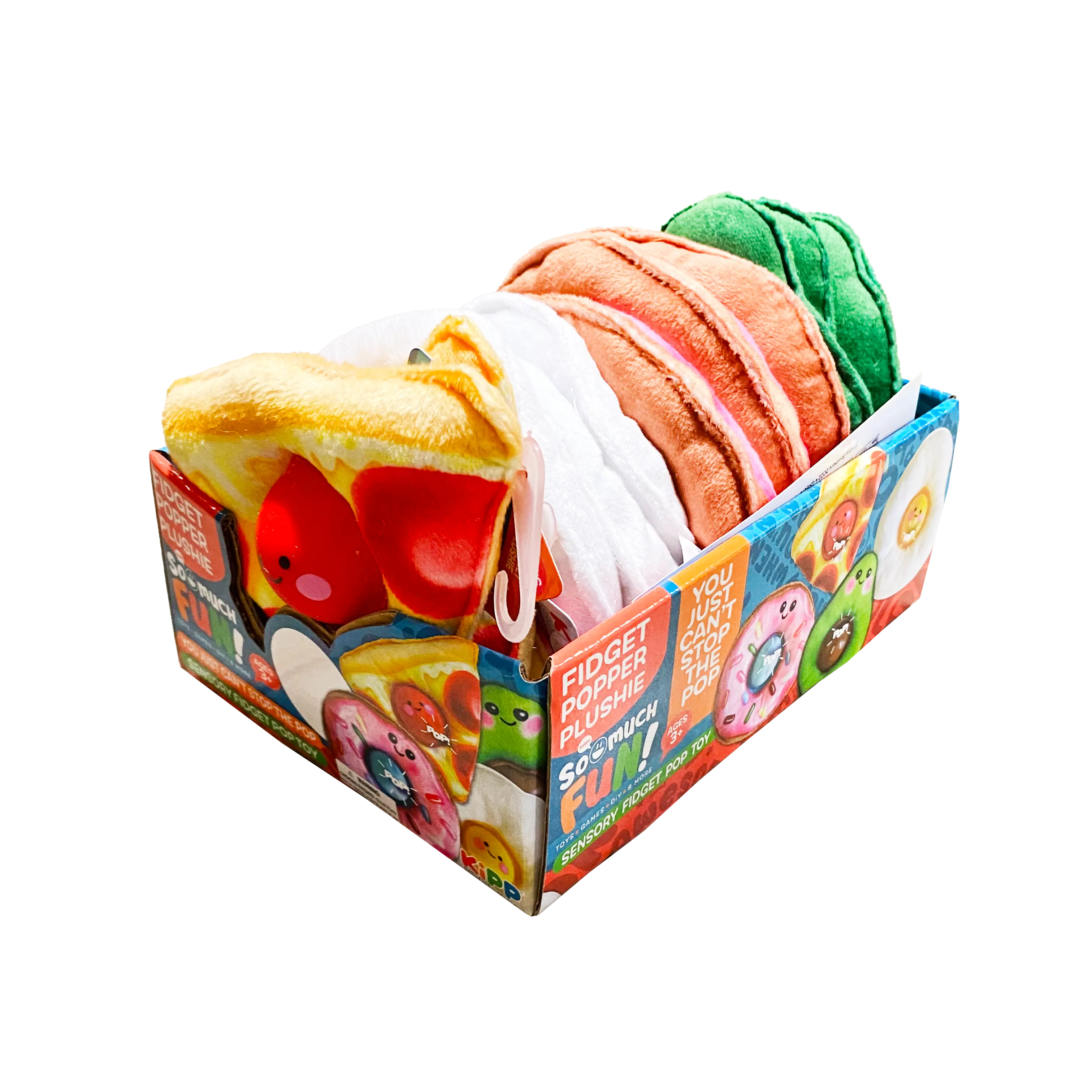 A Kipp Brothers' EXCLUSIVE! 5.5" Fidget Popper Plushies are soft and cute plush with a jumbo pop in the middle. Four assorted styles. Collect them all. 12 plushies in a color display box with toy bin card included for use on the So Much FUN! Toy Bin Program corrugated display or in the clear toy bin pockets. Product fits short or tall bins.